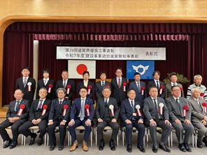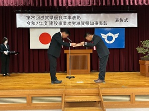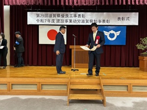 令和7年11月14日(金)県庁において、令和7年度建設事業功労滋賀県知事表彰の表彰式が行われ、当協会会員の長谷川勇吉郎氏(ア・ア・ン コーポレーション(株)取締役営業部長)が受賞されました。あわせて、滋賀県管工事協同組合より当協会会員の森田重吾氏(森田水道(株)代表取締役)が受賞されました。